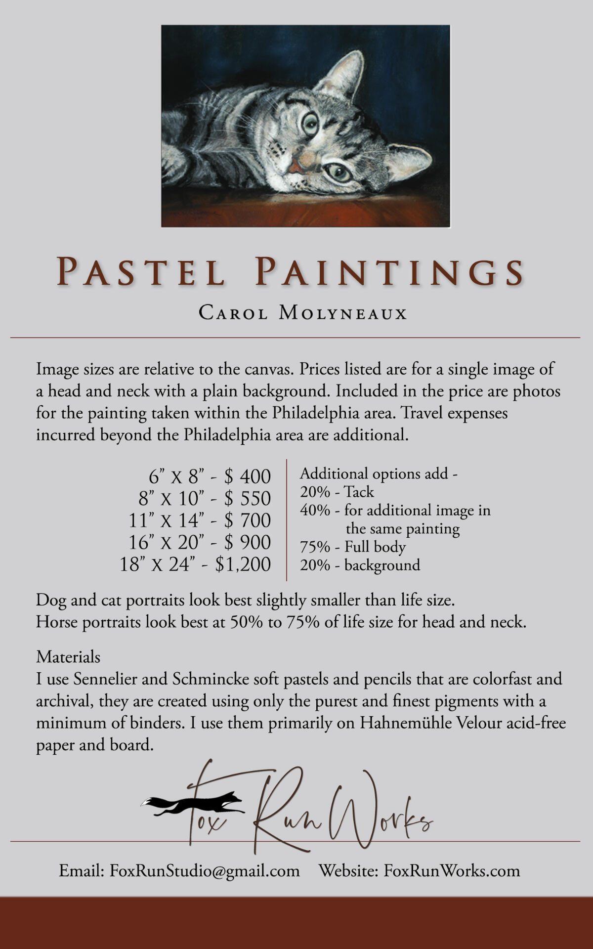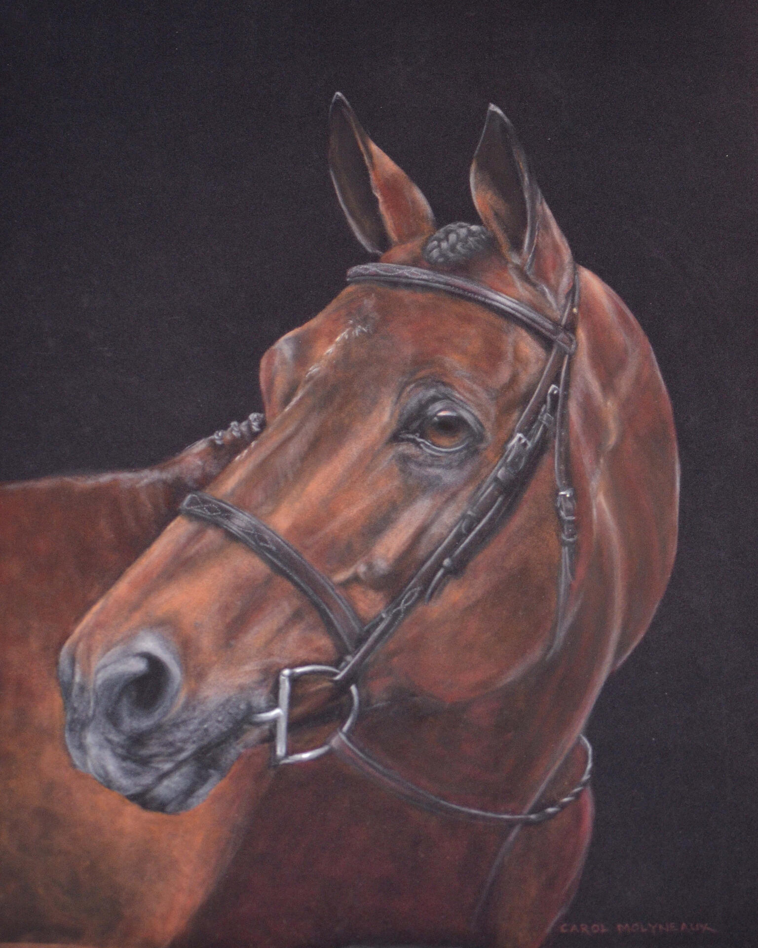 I have always been drawn to and captivated by the beauty of the natural world and have sought subject matter and mediums that have allowed me to explore these themes. Creating pastel animal portraits and bringing these beloved family members to light is immensely satisfying, especially knowing how important these life partners are or have been.I once wondered what it was that drew me to detail in my work, and it occurred to me that at a very young age, my blind father would ask me, “What do you see Carol Ann?". I learned to look and see, to discover details beyond a cursory glance.After years of working as a graphic designer, I realized I needed to align myself more with the natural world. When I asked myself, “What do you really want to do,?” an inner voice said, “draw horses” (this may have been my 12-year-old voice). So, one portrait led to another and then to another...Thank you for your patronage and for supporting the arts.*